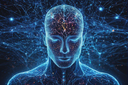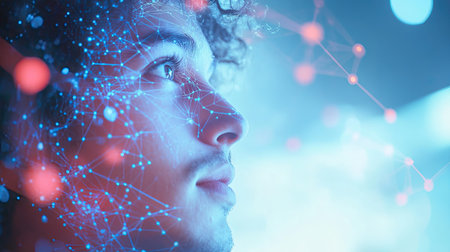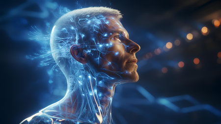 A digital composite image of a person with neural network activity overlay, symbolizing deep thought, innovation, and the complexities of the human mind. Generative AI.