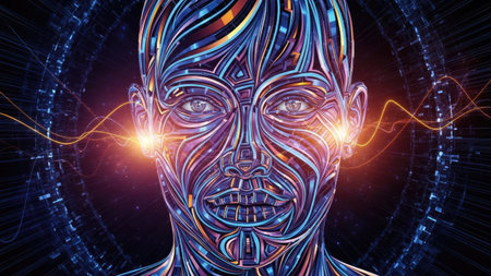 Artificial intelligence face emerging from futuristic data stream