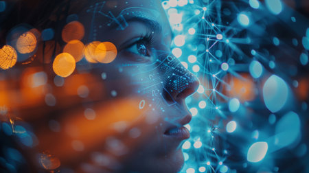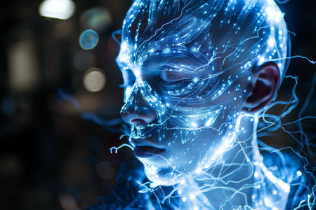 A close-up of a futuristic human face illuminated by intricate blue digital light patterns, creating a high-tech and surreal effect.
