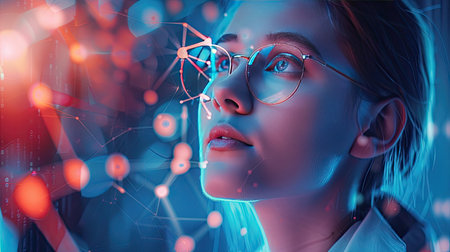 Futuristic Woman Analyzing Data with Virtual Reality Interface in a High-Tech Environment
