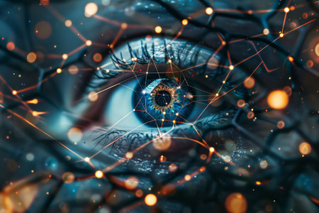 An abstract image depicting a human eye with a glowing blue iris surrounded by a complex network of connections, representing technological concepts.