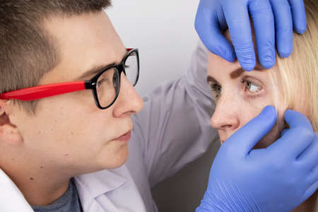 ophthalmologist doctor in exam optician laboratory with female patient. Eye care medical diagnostic. Eyelid treatment