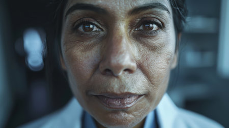 A close-up portrait of a middle-aged Indian female scientist