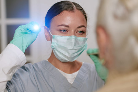 Caucasian young adult woman wearing medical mask and gloves examining ear of senior Caucasian woman using otoscope, focusing on healthcare professional performing medical checkup