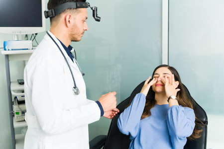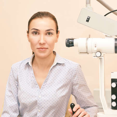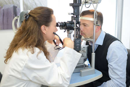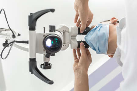 Ophthalmologist using medical equipment, appointment at the hospital