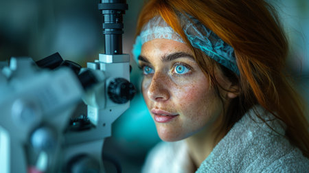 Young female patient with vibrant red hair and striking blue eyes undergoes an eye examination. She is looking into advanced diagnostic equipment in a medical setting.