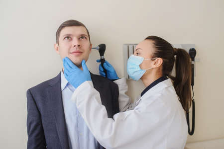 close up photo of a female otolaryngologist examining the ear of a male patient