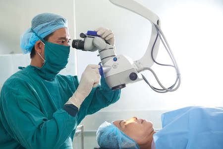 Focused Asian man in mask and coat of surgeon looking at eyes of woman on table using operating microscope