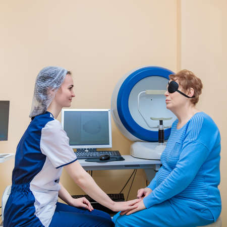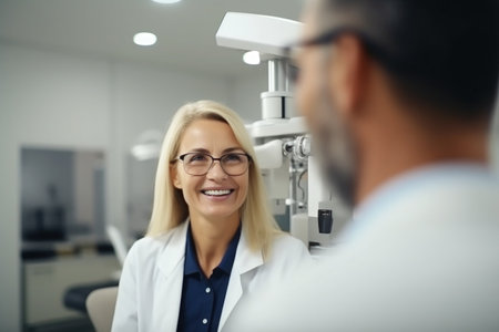 Mature female ophthalmologist in clinic talking to her patient. High quality photo