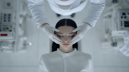 A woman with closed eyes undergoes a futuristic medical examination or procedure in a sterile, high-tech laboratory setting.