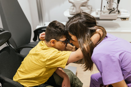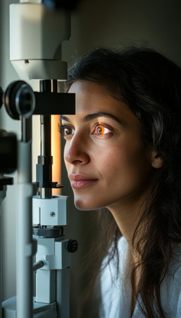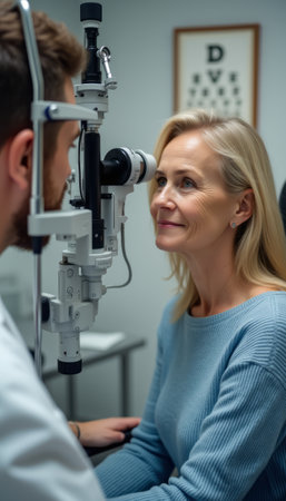 A skilled optometrist attentively examines a middle-aged womans eyes using advanced equipment in a bright, clinical setting. The womans calm expression reflects trust and reassurance, highlighting the importance of eye care and professional expertise.