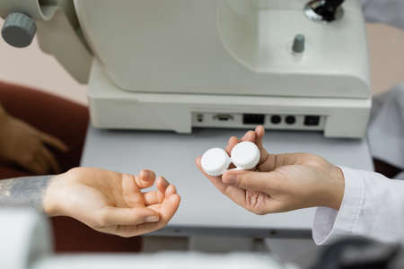 cropped view of oculist giving lens case to patient near vision screener