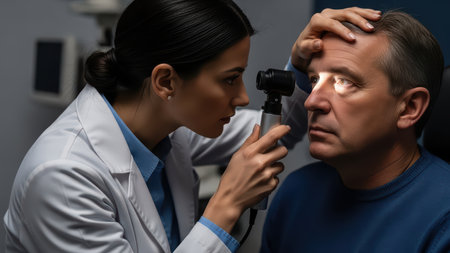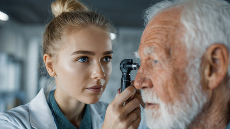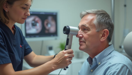 In a bright, modern medical office, a healthcare professional is intently examining a patients eye with an advanced otoscope. The patient, a middle-aged man, displays a calm demeanor as he undergoes this important check-up, highlighting the trust and professionalism in the healthcare environment.