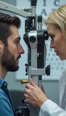 A focused eye doctor, a woman with blonde hair, examines a man’s eyes using a precision instrument, creating a moment of connection. The scene captures the seriousness of eye care, highlighting the trust and professionalism in a clinical setting