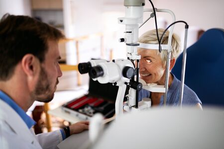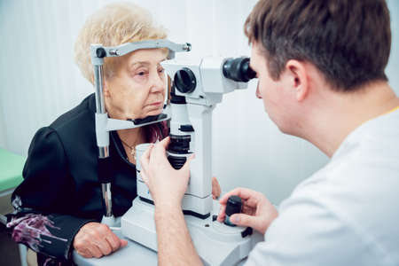 ophthalmologist examination of elderly man with slit lamp. medical equipment