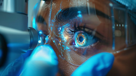 Detailed view of surgeon's intense gaze during a precise medical procedure with loupes.