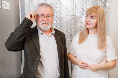 an elderly man with an ophthalmologist chooses glasses in the optics salon.
