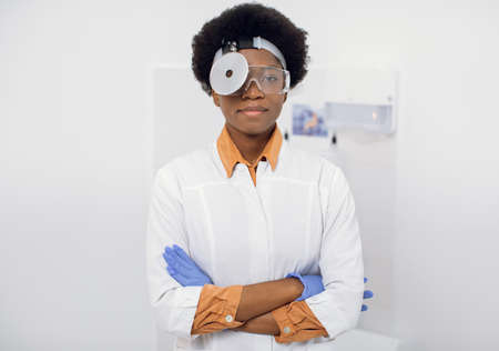 Portrait of young pleasant African American woman, confident ENT otolaryngologist doctor, wearing white lab coat, head frontal reflector and protective glasses, posing to camera with arms crossed