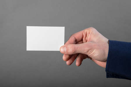 A man holds a white business card. A paper in the hands of a man. Prepared for your text. Isolated on a gray background.