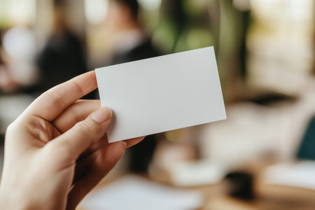 A hand holds a blank card amidst a casual gathering of professionals in a friendly setting, portraying the potential for ideas and communication in the air.