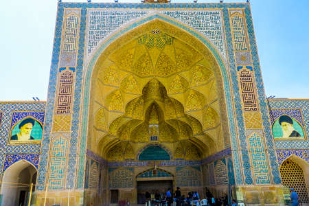 Qom, Iran - 2017: Details of the decorations of the magnificent Iranian (Persian) Mosque Fatima Masumeh Shrine in gold colour