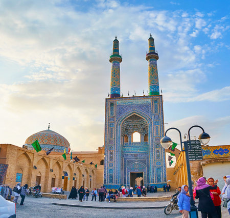 YAZD, IRAN - OCTOBER 18, 2017: The beautiful court in front of Jameh Mosque with brick niches and masterpiece entrance portal (iwan), decorated with fine ornaments of tile, muqarnas and tall minarets, on October 18 in Yazd