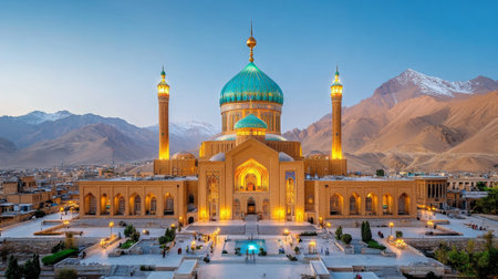 Iconic view of central Asia mosque at sunset, inspired by isphahan culture. Beautiful Islamic architecture. Travel, culture and education concept