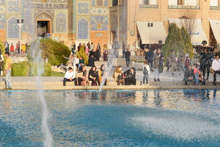 Isfahan, Iran - March 21, 2018: Iranian people rest rest near fountain at Naghsh-e Jahan Square