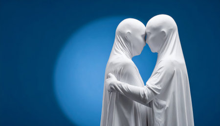 A romantic silhouette of a couple sharing an intimate moment, surrounded by vibrant pink and blue lighting that creates a dreamy atmosphere.