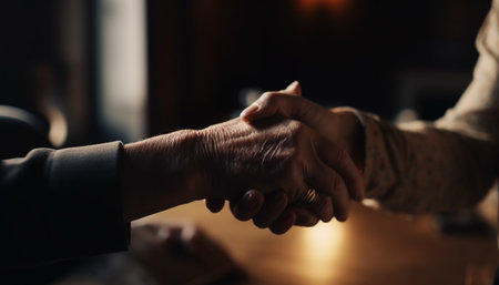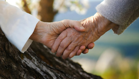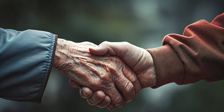 Two elderly individuals share a warm handshake, their hands showing signs of age with wrinkles and tenderness. The scene captures a moment of connection and compassion between them.