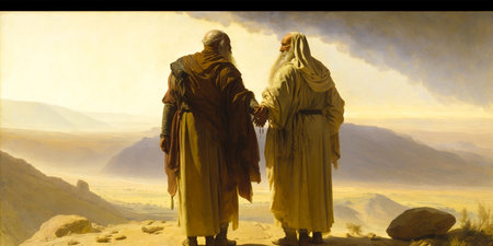Two starters, almost the same height, stand on top against the background of the spreading lower landscape. They make a covenant, a sacred contract between God and man.