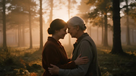 A young person gently holds an older person's hands, bathed in a warm golden hour glow. The shallow depth of field adds a cinematic realism, highlighting the emotional connection.