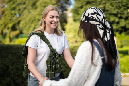 Two women shake hands in an outdoor urban setting, smiling and meeting with style