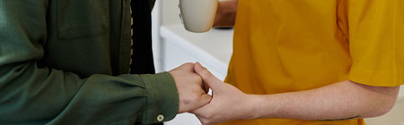 A young gay couple holds hands in their modern apartment, enjoying a quiet moment together.