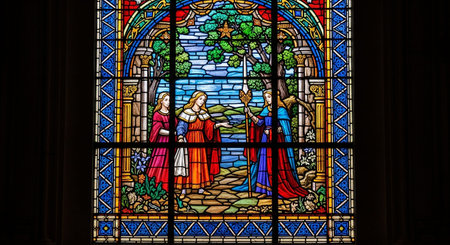 A richly colored stained glass window depicting a scene with three women in a lush garden setting. The figures are rendered in vibrant hues of red, blue, and yellow, wearing flowing robes. They stand amidst stylized trees and foliage, with a body of water and a starry sky in the background. The intricate lead lines and detailed glasswork create a visual narrative, characteristic of historical church and decorative architectural
