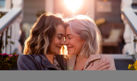 Two women with eyes closed, embracing each other in a moment of connection and intimacy, conveying a sense of love and unity.