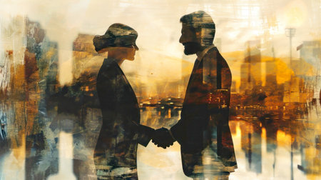 Stylized and fantastical depiction of two people shaking hands in front of a hyperrealistic textured nature painting