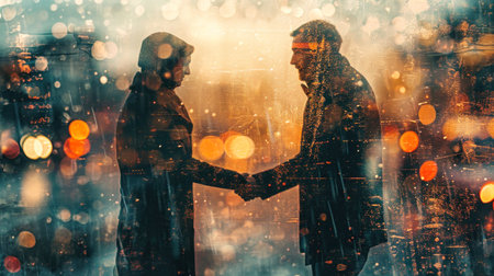 Two businessmen make a deal, shaking hands against the backdrop of a modern cityscape. Silhouettes of people on an abstract city background. Modern business.