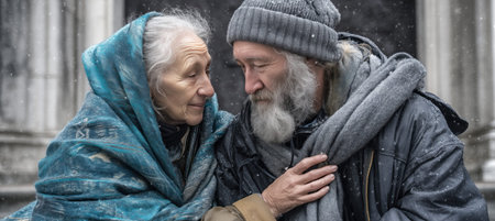 Elderly couple experiencing homelessness finding comfort in each other's company on a cold winter day