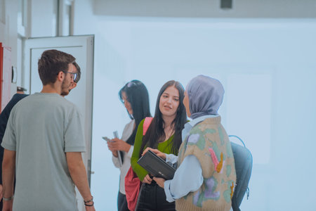 In a school hallway, a diverse group of students takes a break from their classes, engaging in lively conversations that reflect the rich tapestry of their multicultural friendships
