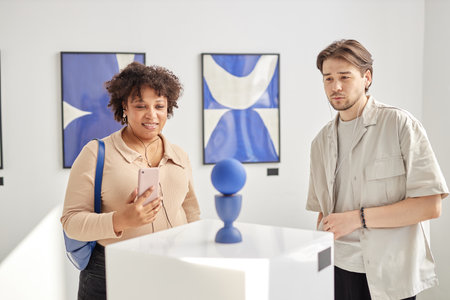 Minimal waist up portrait of two young people looking at abstract art sculpture and wearing earphones while visiting modern gallery or museum