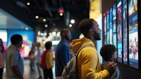 An African-American father and son deeply engage with a digital exhibit in a modern museum.