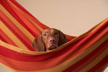 Funny dog is resting in a hammock. Hungarian vizsla on a beige background in the studio.