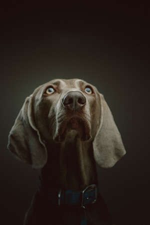 Purebred Weimaraner dog. Studio shot. Moody dark lighting, dark background.