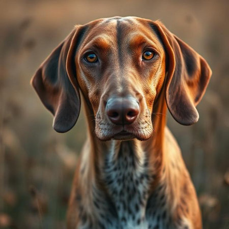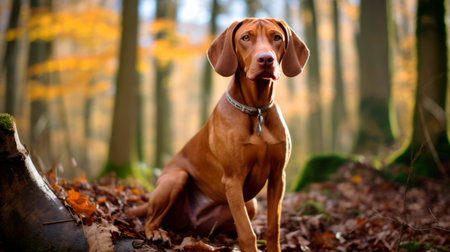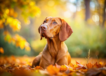 A beautiful Hungarian Vizsla dog poses for a portrait, its intelligent eyes gazing forward. The warm, golden light of an autumn afternoon creates a soft bokeh background, highlighting the rich, russet color of its coat and its noble, loyal expression.