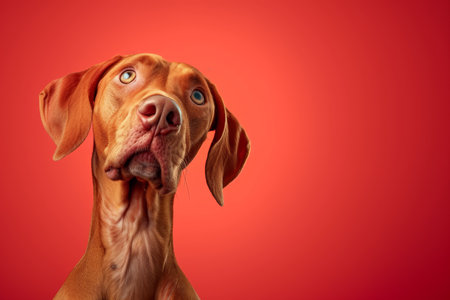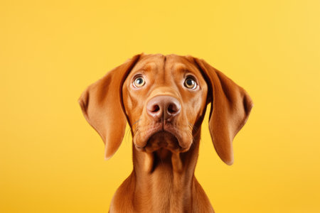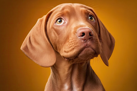 Cute hungarian vizsla puppy studio portrait. Head shot of a dog looking up, with a bright yellow background. Generative AI