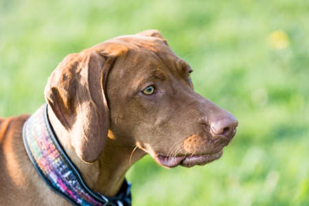 Beautiful Hungarian vizsla dog portrait. Vizsla hunting dog lying down in a garden and looking to the side. Dog background.