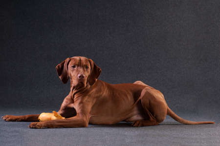 dog on on a yellow background. Charming and emotional Hungarian Vizsla