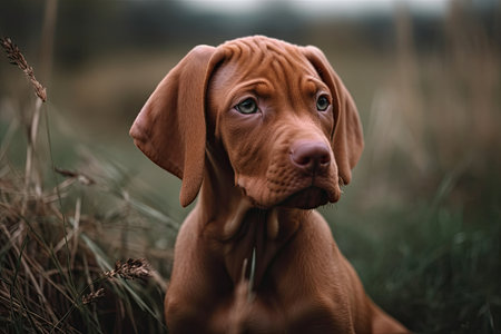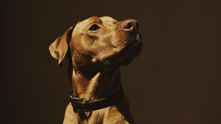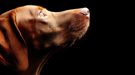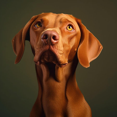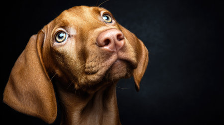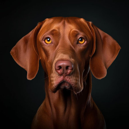 A portrait of a brown vizsla dog against a dark background, AI-generated.