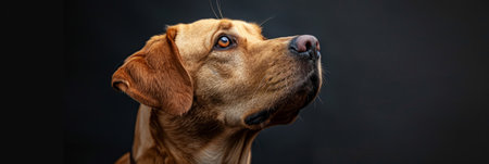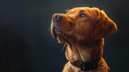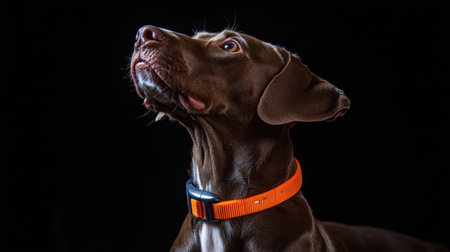 A striking profile of a brown dog with an orange collar, displaying an alert and curious expression against a seamless dark background, perfect for animal lovers and pet enthusiasts.